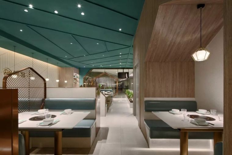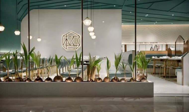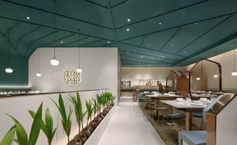 天花之上,是那翻涌着的海浪 ,还有那被无限放大的椰树叶子脉络 ,如此营造出在深海之中吃椰子鸡这般新奇的氛围。金属材质被应用 ,使得餐厅的轻奢之感 ,以及高级之感呼之欲出。