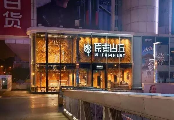 门头设计,简单又大方,还十分直观。其主色调为金黄,暖橘色灯光洒在屋内,并透过玻璃散射而出,显得格外明亮且柔和,恰似小麦一般,给人带来亲切、质朴之感。