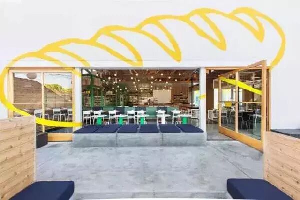 该店没设计那种醒目的文字招牌,而是大胆,运用夸张的面包涂鸦,以此来凸显自身店铺的独特风格,还精准地向顾客传递了类别,以及经营特色。