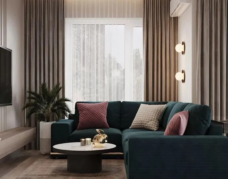 客厅整体以木色为主,搭配一张墨绿色的沙发,沙发显得格外抢眼,吊顶上装了木质吊顶,还是蛮特别的设计。