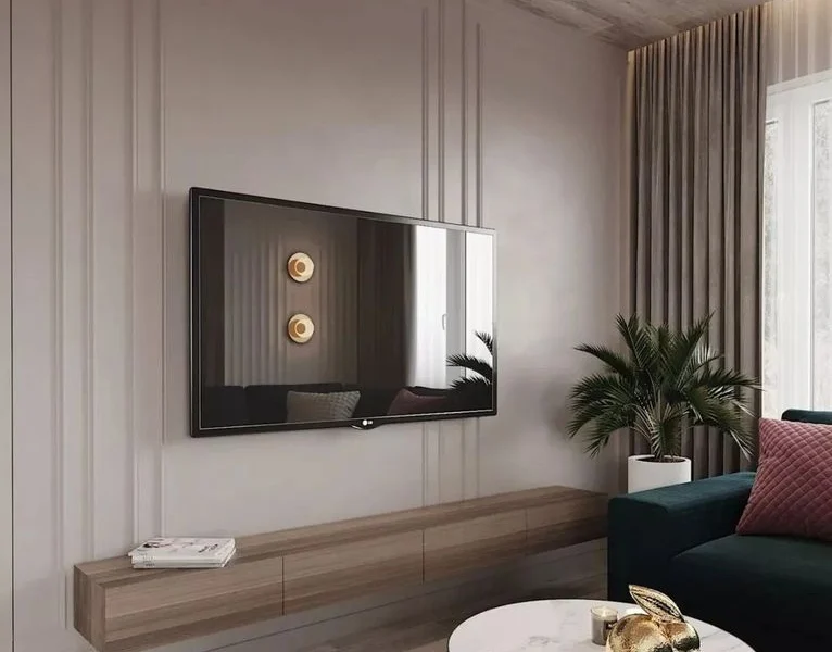 电视背景墙做了护墙板设计装修餐饮设计,定制了一条悬空的电视柜,显得的更加轻盈装修餐饮设计,客厅空间虽然不是很宽敞,但是看起来还是非常大气的!