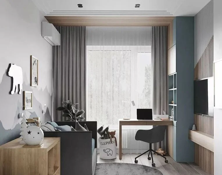 这一家你是儿童房,儿童房功能好齐全有玩耍区、休息区、学习区,在靠近窗户的地方定制了一张书桌。