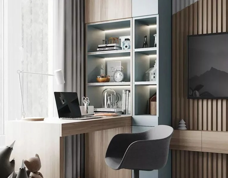如果你家也是这样户型的话,可以参考一下这个书柜的设计,连着书桌组合起来,节省空间,搭配又好看!