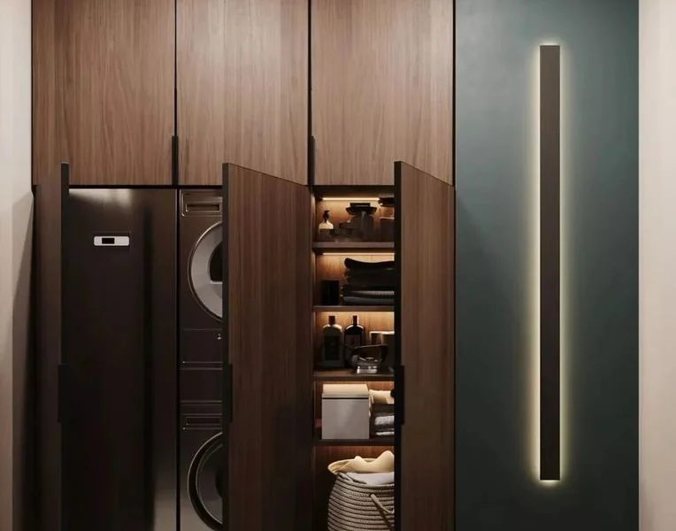 这是洗衣房,定制一个超大的洗衣柜,把洗衣机嵌入进去,洗衣机和干衣机叠放起来,把门关起来的时候,就可以很整洁了。