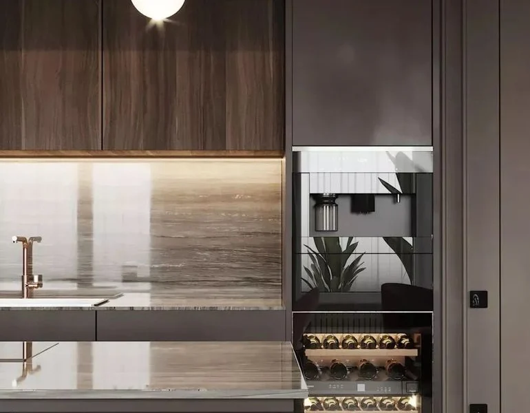 开放式厨房设计,灰色的门板看起来很高级,局部搭配灯带,质感十足!中间还有一张小岛台,开放式厨房也是很实用的!