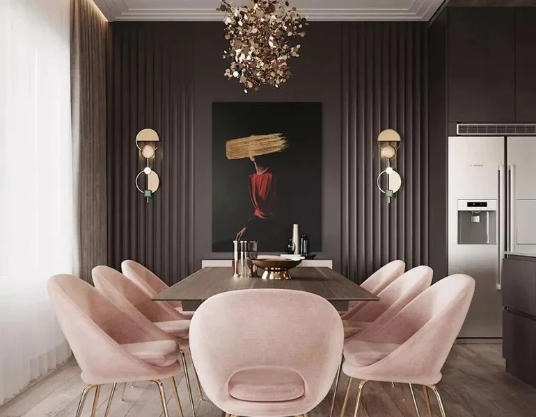 餐厅餐厅设计太美了!上方的吊灯很漂亮,旁边墙面还挂了一幅画,整体看起来很优雅,很喜欢这套餐桌椅装修餐饮设计,粉色与金色搭配,看起来很精致!