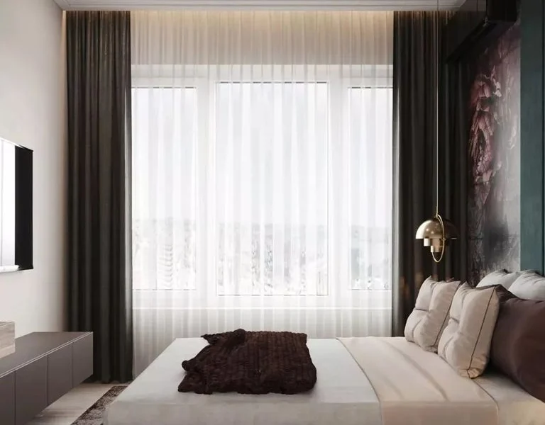 这一间是主卧,主卧也局部运用了绿色和金色来点缀,吊顶上采用无主灯设计,简洁大气!