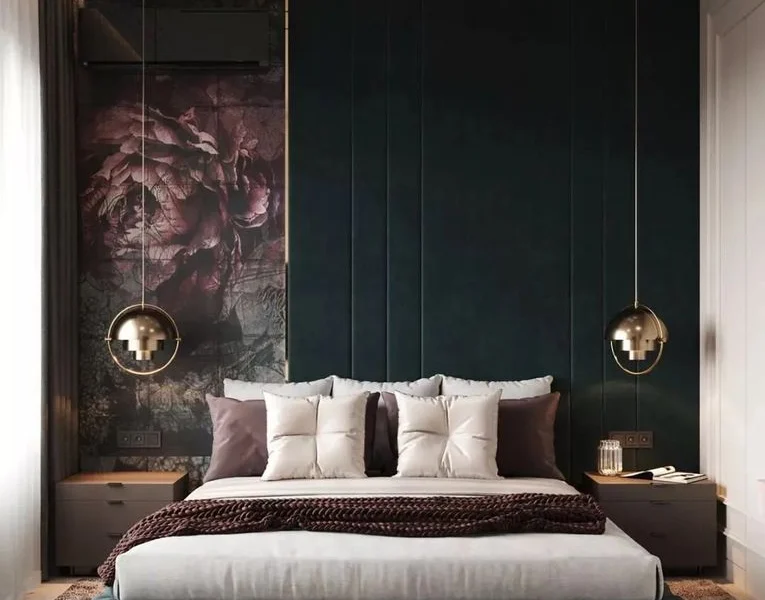 床头背景墙采用硬包与壁纸搭配设计,两侧装了两盏吊灯,美感十足!