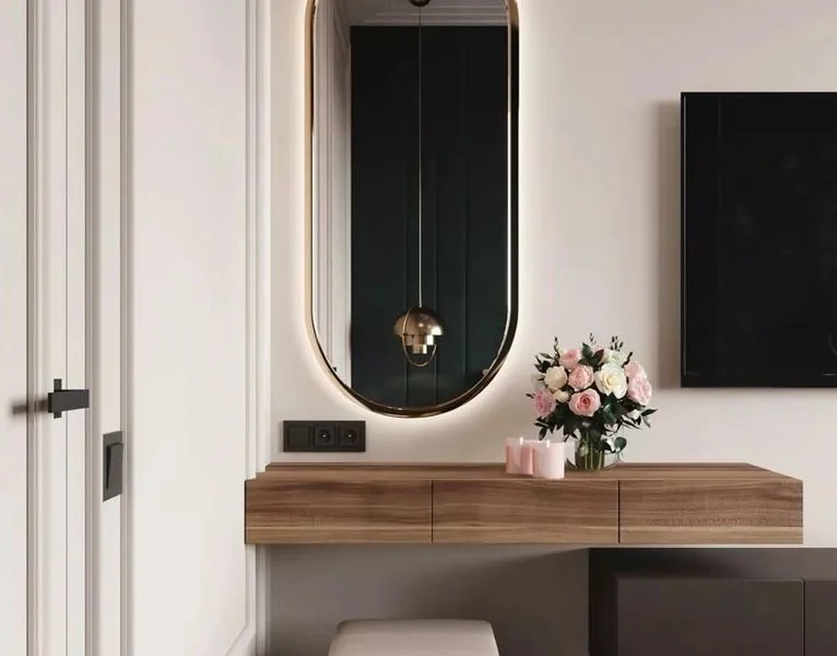 床尾的地方定制了一张梳妆台,悬空设计,搭配一面镜子,很简洁又很优雅!