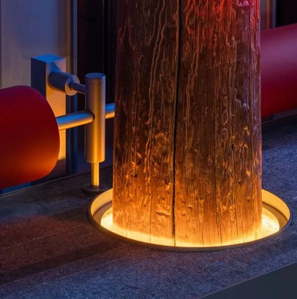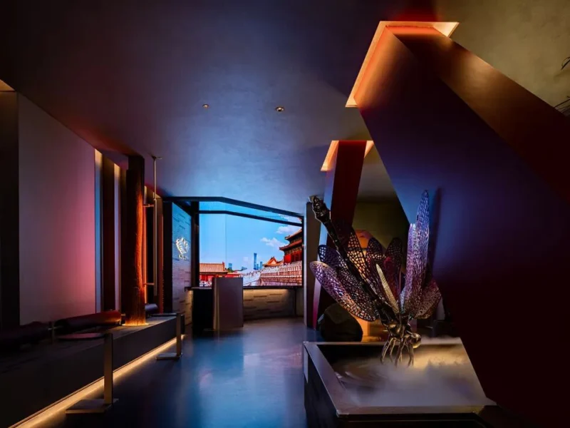 由入口至开放的散座区经过一段折廊,新旧北京的城市影像前,古老的木梁与重力感十足的倾斜结构体一古一今,利落轻盈的金属材料的加入为细部注入了现代感,等位区也不着刻意,延续了这一区域的体块互构又完全满足了实用性。山石水景皆以表意为主,打破传统的空间构成使这些自然风物有了更多观看视角。