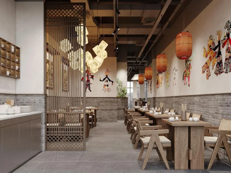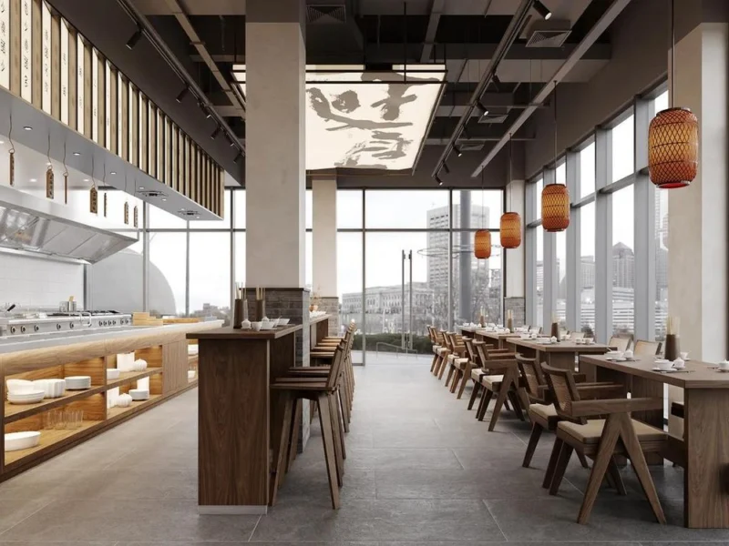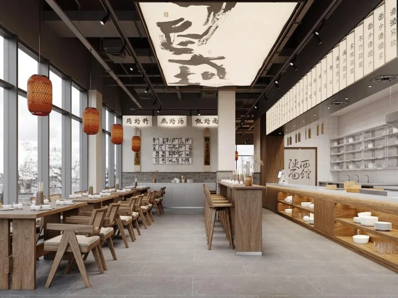 - 噪音控制:厨房与前厅之间需装“静音门”(如带密封条的铝合金门),前厅天花板可局部装吸音板(降低人声、餐具碰撞声),避免噪音过大导致顾客交流困难。