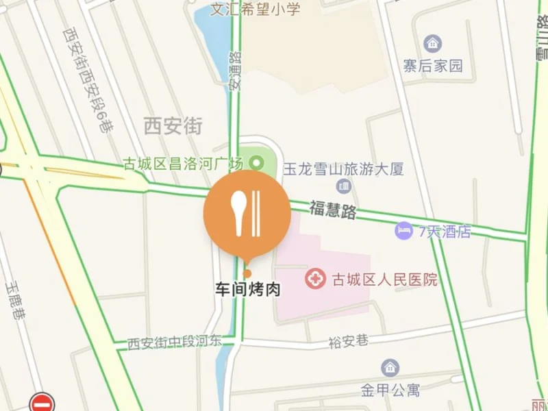 车间烤肉(昌洛河店)位于古城区昌洛河河滨时光C20—3,古城区医院大门往西20米,左拐沿河直行50米即到。