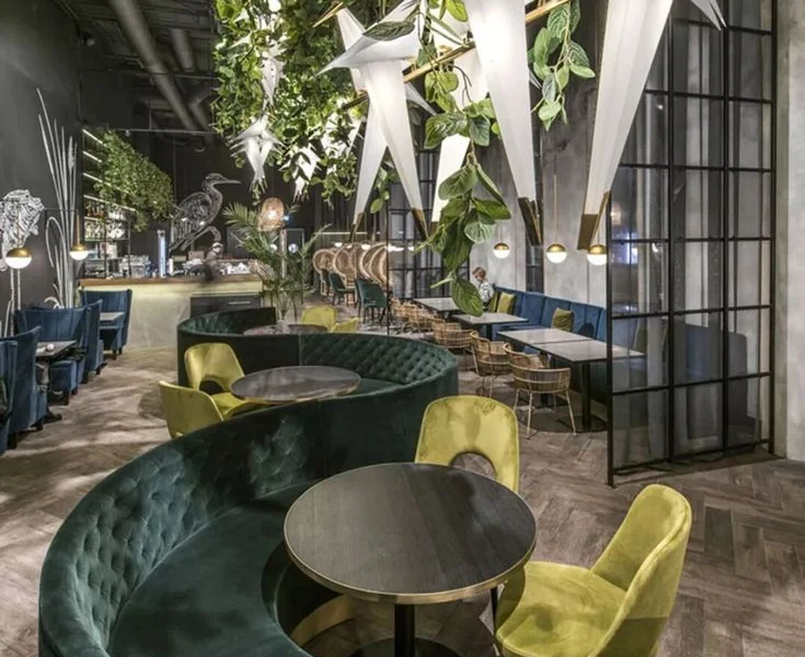 大自然就好似拥有神秘的力量设计一个主题餐厅,给人带来亲切感。丛林主题餐厅内设计一个主题餐厅,绿植环绕点缀的空间,让人感到赏心悦目。灰色搭配上亮色,沉稳而又不失活跃情趣。精致别样的鸟型灯具,更是点燃主题,提升空间的档次感。