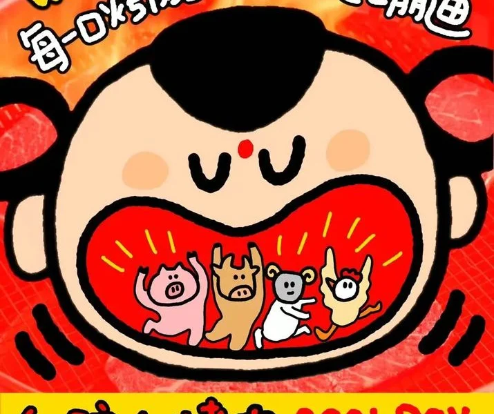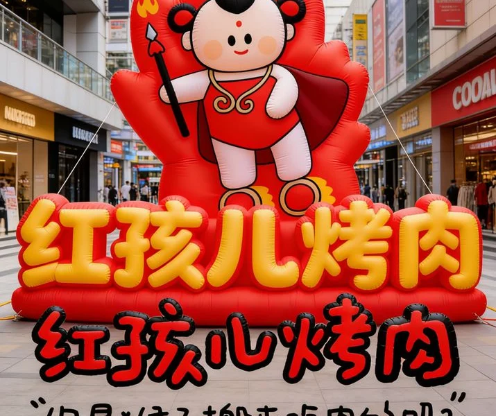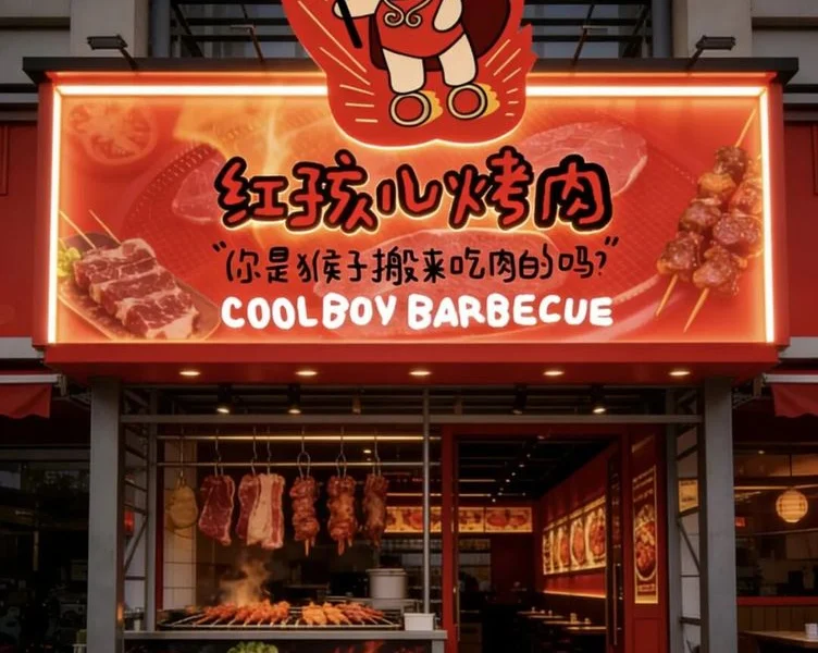 将巨型红孩儿IP置于门头顶部核心位置,搭配16:9宽幅发光灯箱,以高饱和中国红为主色调,形成强烈视觉冲击。IP形象、品牌字标、趣味「你是猴子搬来吃肉的吗?」分层排布,既强化品牌识别,又用玩梗式文案制造传播话题;