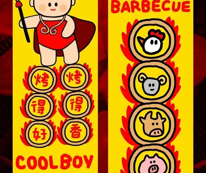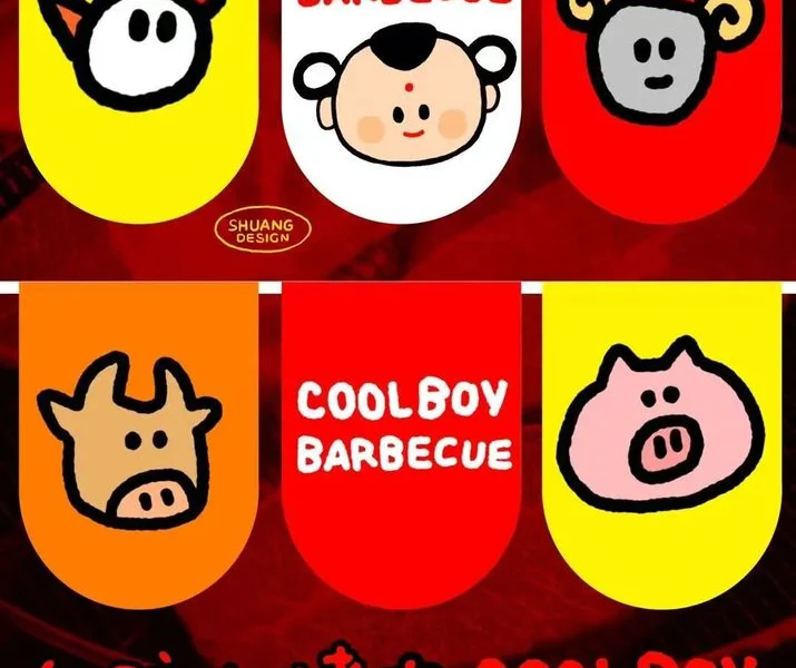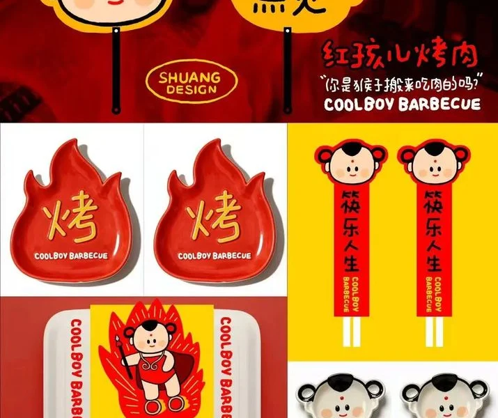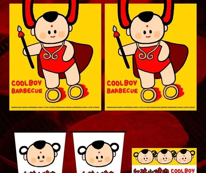 提取《西游记》中红孩儿「三昧真火」的核心记忆点,将传统神话形象进行Q版萌化重构:保留火尖枪、风火轮、火焰光环等标志性元素,用圆润线条弱化攻击性,打造软萌讨喜的视觉形象烧烤店品牌形象设计,既唤醒大众的文化共鸣,又契合Z世代审美。