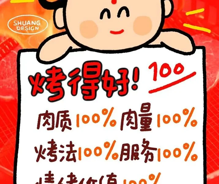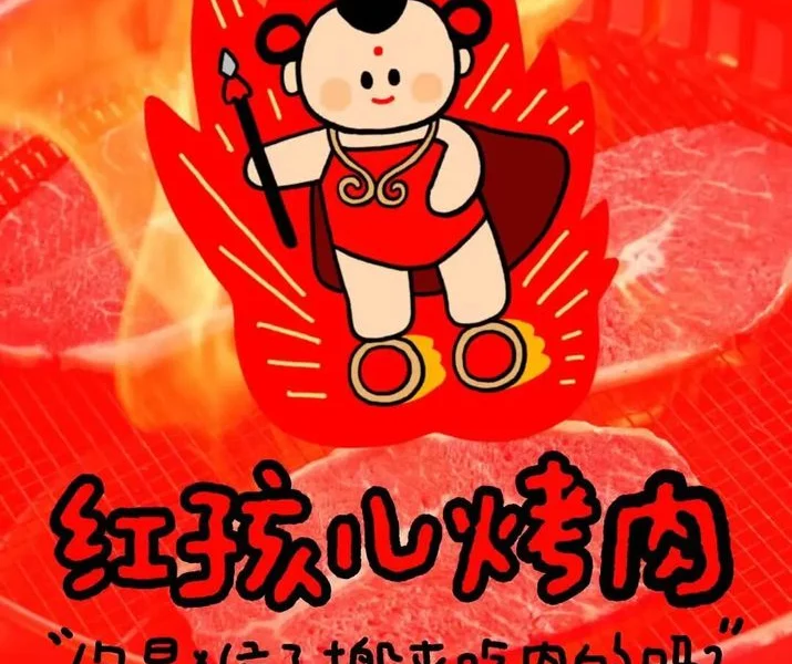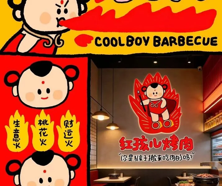 更关键的是,红孩儿的「火」属性与烤肉「炭火烹饪」的品类属性形成天然强关联,将神话符号转化为餐饮品类的视觉锚点,让消费者一眼识别品牌赛道烧烤店品牌形象设计,实现IP记忆点与品牌认知的深度绑定,彻底区别于传统烤肉店的同质化设计。